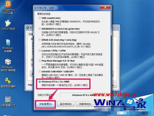 5、如果是舊版本的bootice軟件,XP選擇nt5.x,Win7選擇nt6.x,現(xiàn)在新版,nt5.x/nt6.x混在一起,統(tǒng)一選擇一項即可。選好后,按“安裝/配置”這個按鈕;