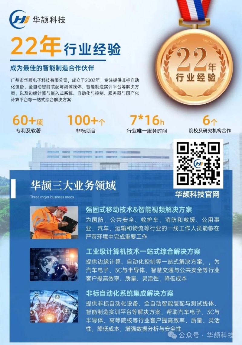 華頡科技憑借22年深耕行業(yè)的豐富經驗,獲得國家級高新技術企業(yè)、廣東省專精特新企業(yè)、廣州市瞪羚企業(yè)、廣東省科技專家工作站等認定榮譽。專注提供非標自動化設備、全自動智能裝配與測試線體、智能制造實訓平臺等解決方案,以及邊緣計算與嵌入式系統、自動化與控制、服務器與國產化計算平臺等一站式綜合解決方案,能快速、全面地滿足客戶多樣化需求。幫助汽車電子、3C與半導體、高等院校等行業(yè)客戶提高效率、質量、靈活性,降低成本,提升客戶的競爭力。