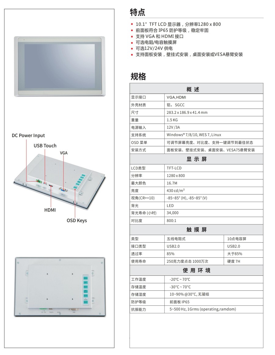 ?10.1" TFT LCD 顯示器,分辨率1280 x 800