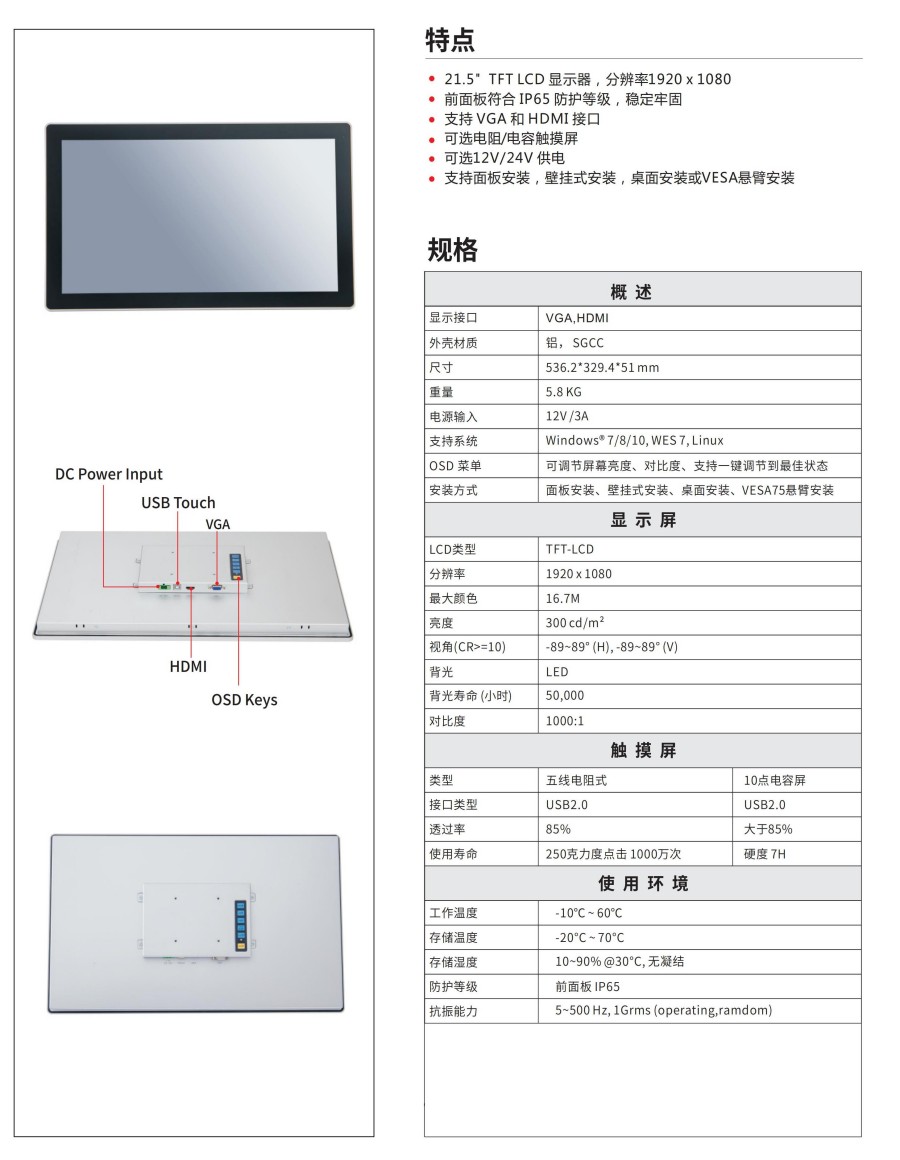 ?21.5" TFT LCD 顯示器,分辨率1920 x 1080 ?前面板符合 IP65 防護等級,穩定牢固 ?支持 VGA 和 HDMI 接口 ?可選電阻/電容觸摸屏 ?可選12V/24V 供電 ?支持面板安裝,壁掛式安裝,桌面安裝或VESA懸臂安裝